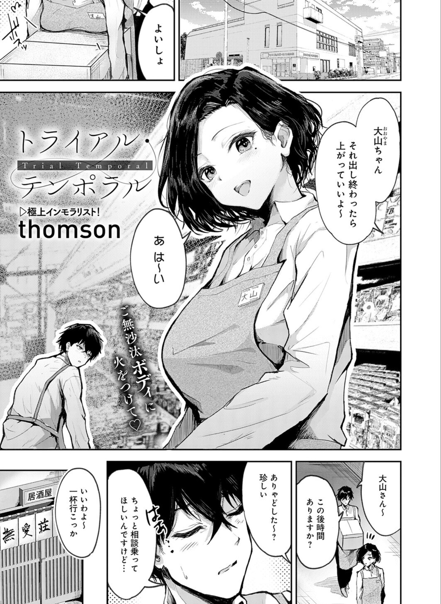 濃密エロスの新鋭・thomson先生が贈る話題作『トライアル・テンポラル』が、FANZAブックスにて新刊独占先行配信されました。本作は、スーパーでアルバイトをする「どこにでもいそうな主婦」大山さんと、彼女のバ先の後輩男子・前川くんが、居酒屋での恋愛相談をきっかけに、禁断の不倫FUCKに発展していくという、背徳感満載の大人エロスです。恵体に自信を持つthomson先生の美麗な筆致で、人妻の抑えきれない欲求と、後輩の巨根が交わる激しい一夜が描かれます。